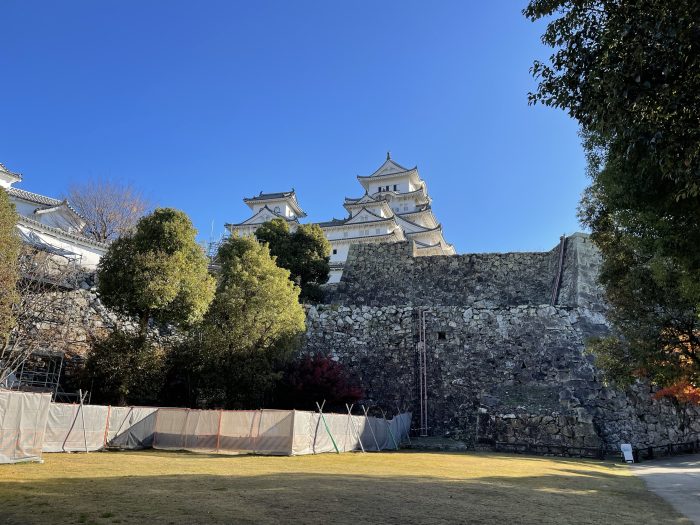大手門を通って三の丸に行くと、目の前に白い姫路城の城郭が一望できます。天気が良かったので、その白い城壁が青空の下、めちゃめちゃ映えていました。さすが白鷺城。